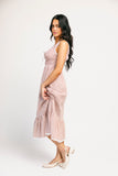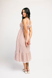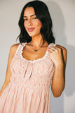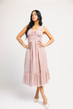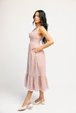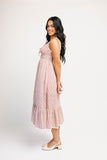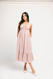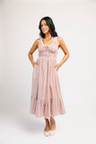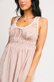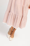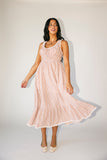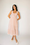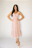 a timeless piece with a hint of country charm, this red pinstripe midi dress is perfect for summer + beyond. with its breezy silhouette + sweet scallop trim details, you can easily dress it up or down for any occasion. a must-have for summer picnics, family pictures, + frolicking around town.