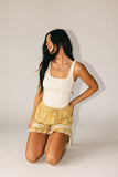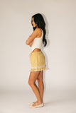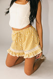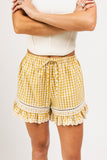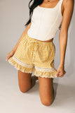 - caramel gingham // high rise, elastic waistband, tie front, eyelet lace detailing, scallop hem