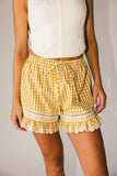 frilly, flattering, + totally foolproof, these lightweight gingham shorts are full of cute outfit possibilities. they have a comfortable drawstring waist + a dainty ruffled hemline, so they’re great for lounging around + hitting the town. the perfect vintage-inspired shorts to pair with tanks, tees, blouses, + sweaters.