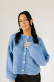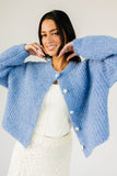 the clothing equivalent of a hug, this cozy blue knit cardigan is luxuriously thick + deliciously slouchy. with its boxy, slightly cropped silhouette, it’s the perfect sweater to layer up or style solo with any outfit.
