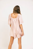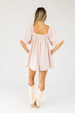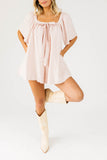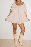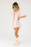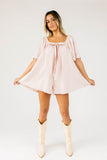 the flowy pink romper of our dreams, it has billowy short sleeves + a stretchy square neckline with a bow detail. made to be dressed up or down, it’s the perfect summer outfit for every occasion.