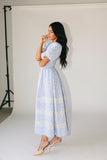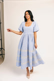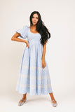 - blue // midi length, scoop neckline, puff sleeves, smocked back, side zipper closure, lined bodice, elastic cuffs, lace trim neckline, tiered skirt with lace detailing, pockets, embroidery throughout