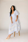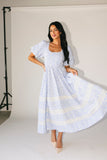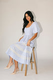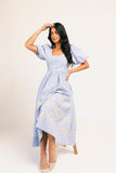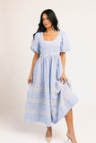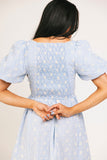 sweet + feminine, this baby blue puff sleeve midi dress gives timeless romance with a chic twist. its vintage-inspired silhouette features a lace tiered skirt + embroidered floral details throughout. the perfect dress for weddings, baby showers, brunch dates, + beyond.