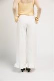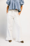 - white // high-rise, wide leg, elastic waistband, pockets, lined throughout, pleat detailing, ruffle hem