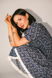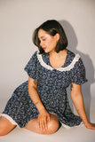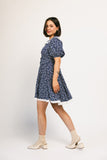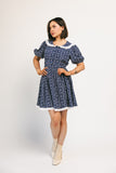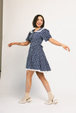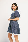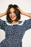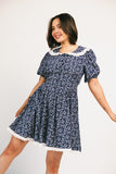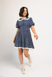 a short + sweet mini dress with a darling navy blue floral pattern. this puff sleeve button up mini dress features a chic, fitted bodice with a flowy skirt that’s perfect for twirling. detailed with eyelet lace trim + a vintage-inspired collar, it’s a timeless piece you can style season after season.