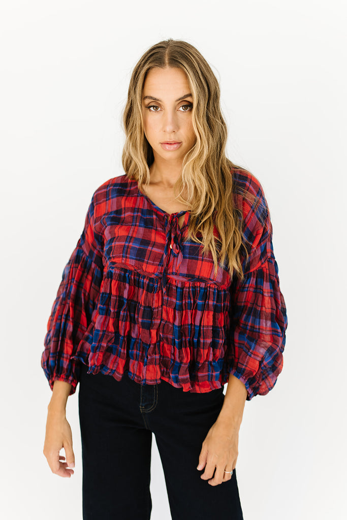 - red + navy plaid // scoop neckline, working tie, front button closure, balloon sleeves, elastic cuff