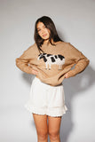 - mocha // crew neckline, drop shoulder, ribbing at neckline hem, and cuffs, knit cow detail