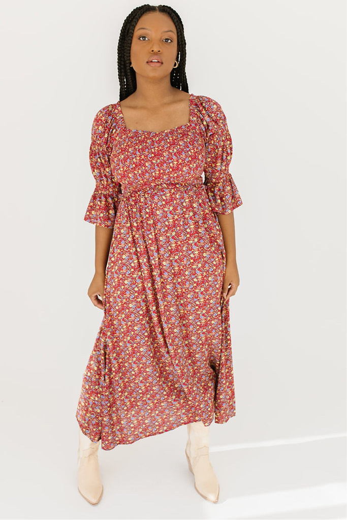 - rust floral // midi length, square neckline, smocked bodice, 3/4 balloon sleeves, working tie, ruffle detail
