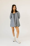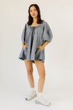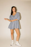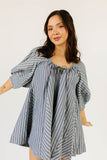 solve any summer outfit dilemma with this dusty blue + white striped romper. kinda flirty + hella fun, it has a flowy, shift silhouette with subtle puff sleeves + an adjustable elastic neckline. the perfect romper for boat days, beach vacations, + all those summer shenanigans.