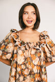 - cocoa bloom // scoop neckline, front tie, dramatic puff sleeves, pockets, contrast stitching on collar