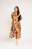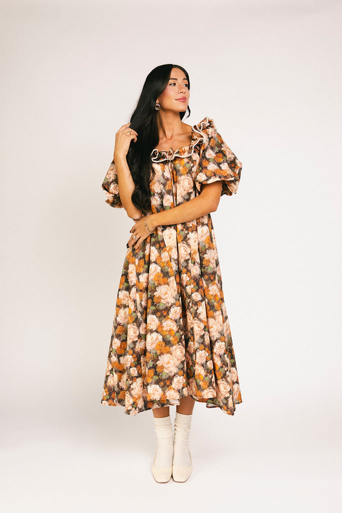 this vintage-inspired puff sleeve maxi dress is guaranteed to be your new go-to. it features a dainty ruffle neckline, dramatic puff sleeves, + a chic muted abstract floral pattern. with its relaxed silhouette + flowy shape, it’s the perfect maxi dress to pair with your favorite heels, boots, sandals, or sneaks.