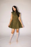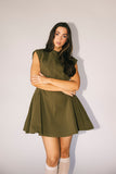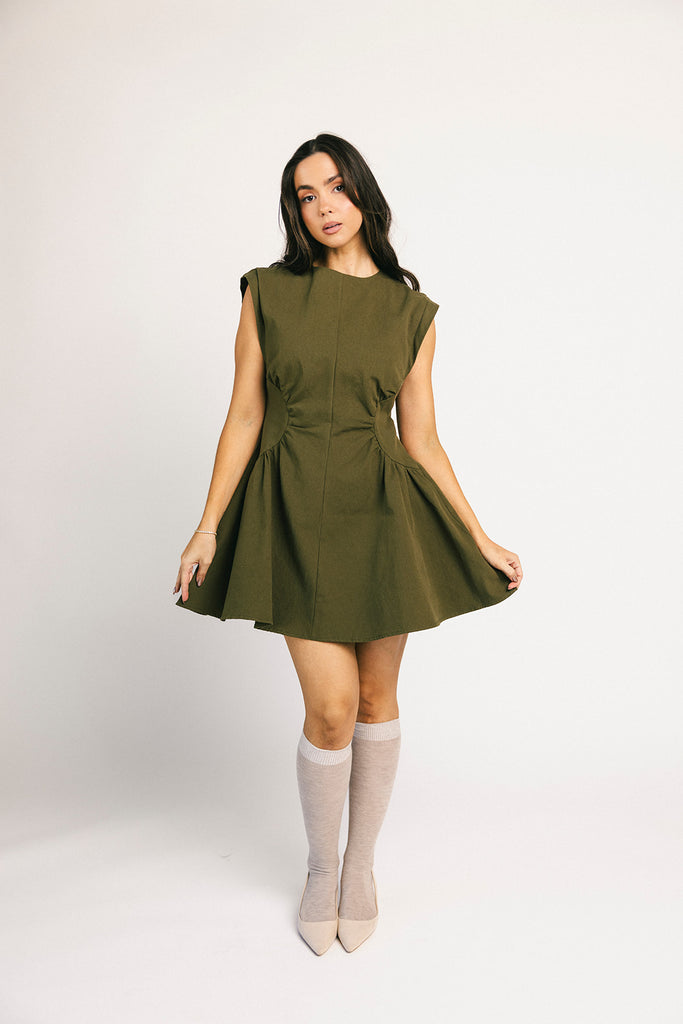 a chic olive green mini dress that can (+ will) cause compliments. featuring a vintage-inspired silhouette with fitted waist panels that sculpt just right, it’s the perfect dress for every occasion. dress it up with kitten heels for weddings + cocktail parties, or down with boots for dinner dates + concerts.