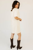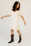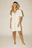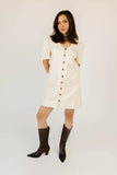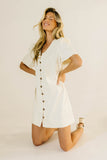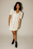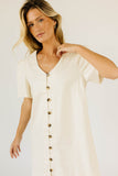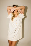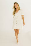 a timeless dress with a retro twist. this short sleeve button up mini dress has a sleek shift silhouette with a classic v-neckline + chic shoulder pad details. whether you dress it up with boots for family pictures or down with flats for casual brunch dates, this neutral mini does not disappoint.