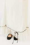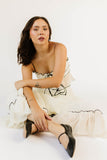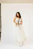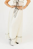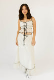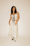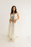 - cream // sweetheart neckline, tie details, adjustable straps, back zipper closure, lined bodice, maxi length, lettuce hem, elastic waistband, lined skirt, lettuce hem detail