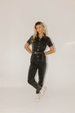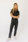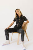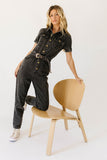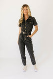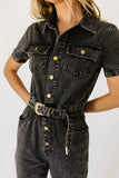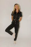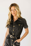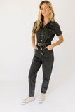 create an instant (+ iconic) outfit with this black denim button-up jumpsuit. with its fitted silhouette + belted waistline, it slims + snatches in all the right ways. the perfect street-style jumpsuit to dress up with heels for work, or down with sneakers for date night.