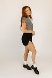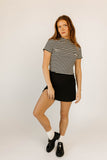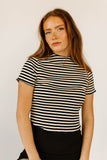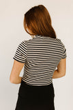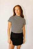 every hunny needs a good black + white striped babydoll tee. the perfect addition to any casual outfit, this striped short sleeve top is cropped + features a chic high neckline. we love it paired with shorts + sneakers for casual outings, or a mini skirt + loafers for dressed up affairs.