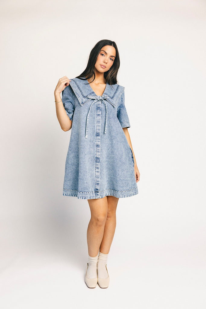 both timeless + trendy, this short sleeve denim mini dress is a must-have for every season. with its chic, boxy fit + oversized collar detail, it’s a piece you can easily dress up or down for any occasion. the perfect denim dress for brunch dates, family pictures, + everyday outings.