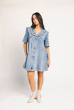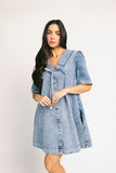 - denim // mini length, v-neckline, oversized collar, front button closures, pockets, front tie, seam detailing