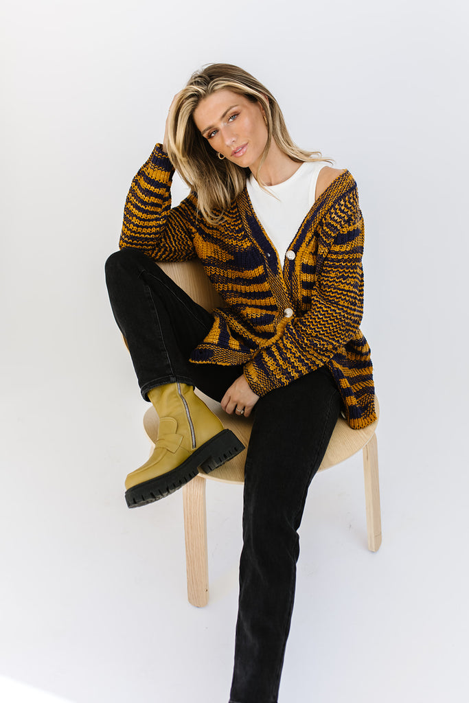 - navy + mustard stripes // v-neckline, buttons, pockets