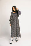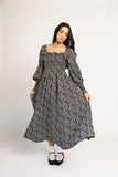 - black // midi length, square neckline, smocked bodices, front tie, ruffle detail, balloon sleeves, smocked cuffs, elastic neckline, lined to thigh