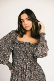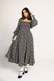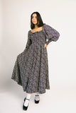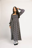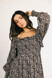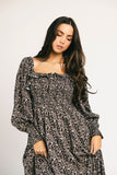 chic + comfortable, this long sleeve black floral midi dress has a timeless feel with a hint of vintage energy. the perfect dress for any occasion, you can style it with heels for fall + winter weddings, or knee high boots for family pictures.