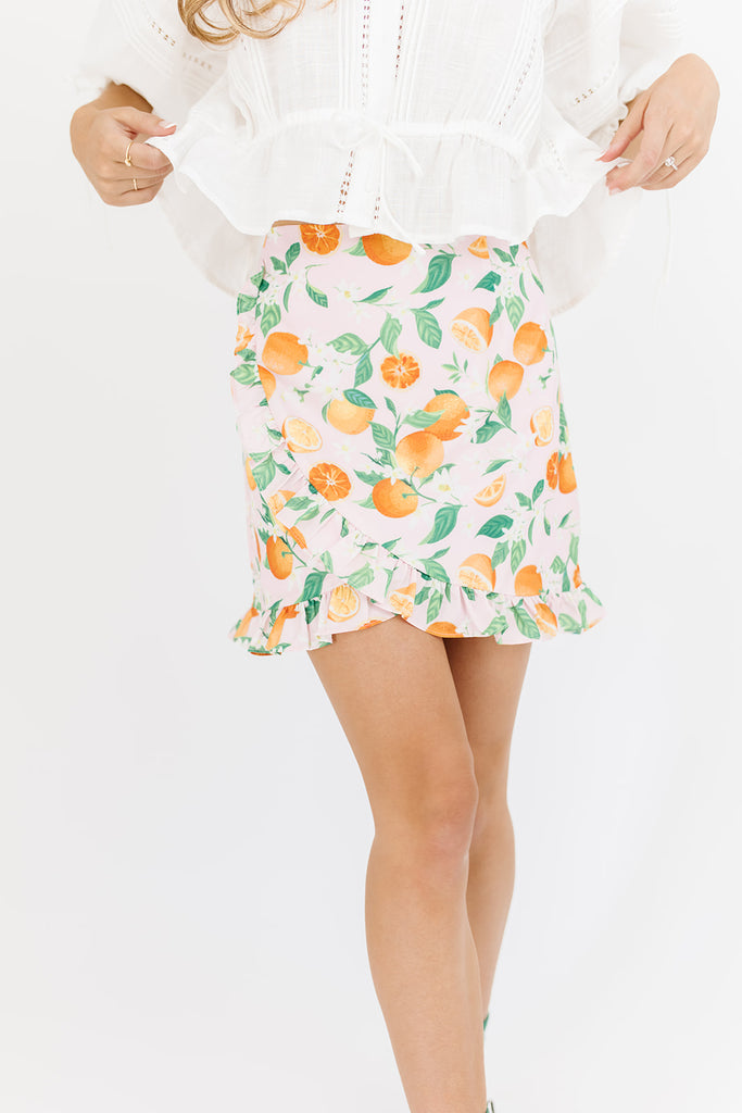 - peach print // mini length, faux wrap, ruffle detail, side zipper