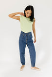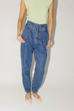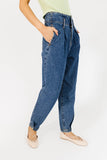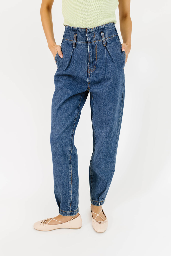 - dark wash // tapered fit, high waisted, zip fly, snap button hem detail, double hook + eye closure, belt loops, front pleat detailing