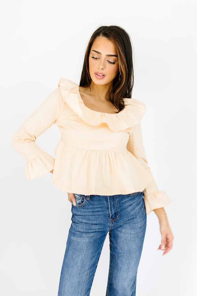 - faded peach // scoop neckline, ruffle detailing, peplum style, open back, back ties
