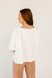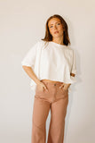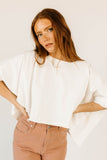 - white // scoop neckline, cropped, high low hem, raw hem, batwing sleeve, cuff detailing