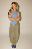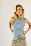 solve any casual outfit dilemma with this asymmetrical blue knit tank. made with a thick ribbed material, it features a sleek high neckline + a trendy v-shaped hemline. a versatile essential, you can pair it with shorts + sneakers in the spring // summer, + jeans + boots in the fall // winter.