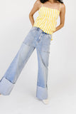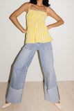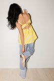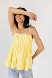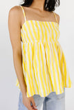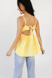 bring some sunny summer vibes to your wardrobe with this yellow + white striped babydoll tank. featuring a classic fit + flare silhouette with a flirty tied open back, this summer top will take you from beach vacations to casual date nights. dress it up with linen pants + heels, or down with shorts + sandals.