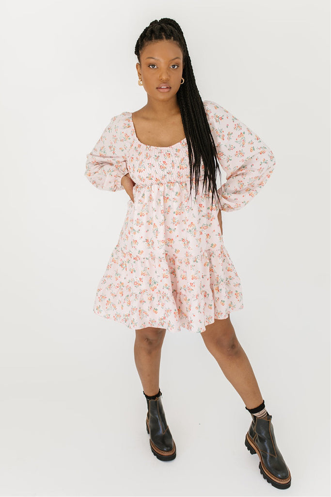 - baby pink floral // long bubble sleeves, sweetheart neckline, smocked bodice, fully lined, tiered skirt