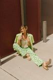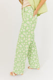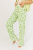 - green // straight leg, daisy pattern, hight waisted, one button zipper fly, belt loops, pockets