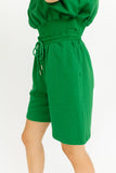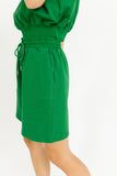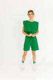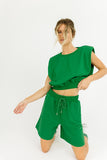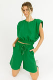 - emerald // two-piece set, crew neckline, shoulder pads, rolled sleeves, elastic waist, adjustable tie, working pockets
