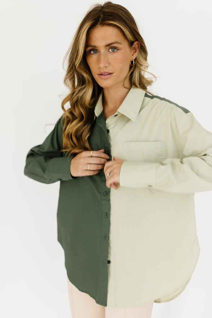 - olive + sage // collared, breast pocket, buttons, cuffed sleeves, color block