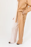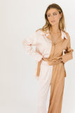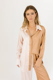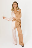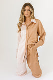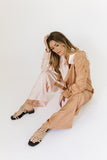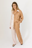 - pale pink + cocoa // two piece set, collared, working buttons, elastic waistband, pockets