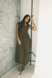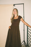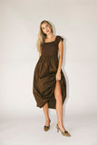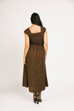 - chocolate // midi length, square neckline, adjustable tie sides, lined to knee, double lined bodice, pockets, elastic waistband
