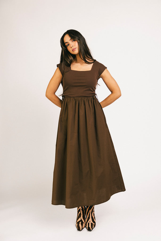 a must-have for every season, this chocolate brown midi dress features trendy cinch ties at the bodice that slim + snatch in all the right ways. the dainty a-line silhouette adds a hint of sophistication, while the sleek short sleeves keep things semi-casual. the perfect dress to take you from day dates to evening soirées.