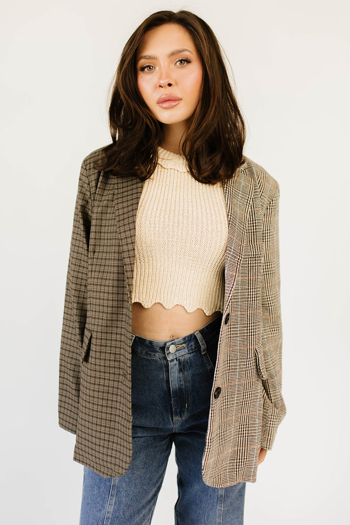 make your it-girl outfit dreams come true with this chic double patterned plaid blazer. comprised of two vintage-inspired brown plaid fabrics, this slouchy blazer was made for compliments. we love it layered over a casual outfit, or as the statement piece in a fall ensemble.