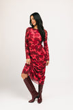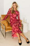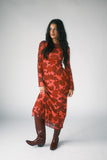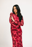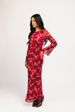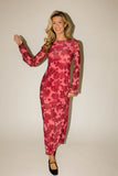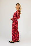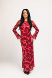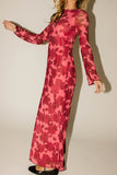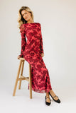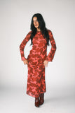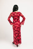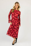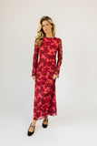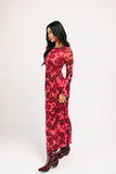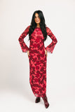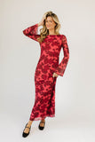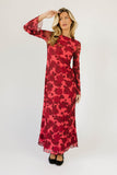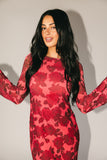 be on your boldest behavior with this vibrant red rose patterned maxi dress. with its stretchy mesh material + flared long sleeves, this y2k-inspired dress is perfect for dinner dates, cocktail parties, + girls' nights out.