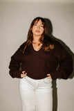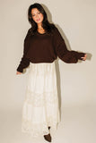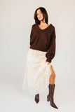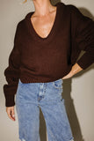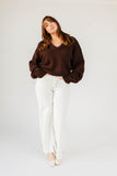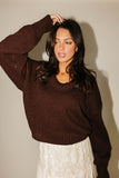 the epitome of cute + cozy, this slouchy scoop neck sweater is everything you’ve ever wanted + more. luxuriously soft + thick, it has an oversized silhouette with long balloon sleeves. whether you layer it over tees + dresses or style it on its own, this chocolate brown sweater was made to be worn over, + over, (+ over) again.