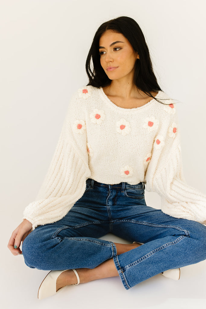 an embroidered knit sweater so soft + sweet, you’ll never want to take it off. this cozy cream sweater has a slouchy fit, drop shoulders, + embroidered flower details along the top. the perfect spring sweater to pair with jeans + skirts for any casual outing.