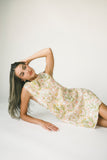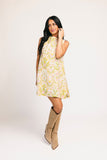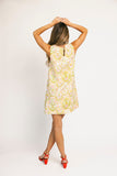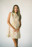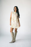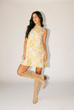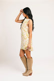 a chic mini dress made for throwing on + absolutely going off. it features a vintage style silhouette with a high neckline + a vibrant geometric floral pattern. whether you style it with strappy heels or knee high boots, it’s the perfect dress for every season.