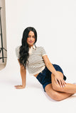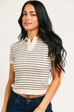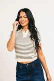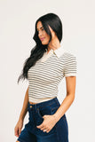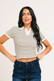 an elevated basic that works for every season, this striped collared knit top is soft, stretchy, + super luxurious. both lightweight + slightly cropped, it’s the perfect top for every season. dress it up with a mini skirt + heels, or down with shorts + sneakers.