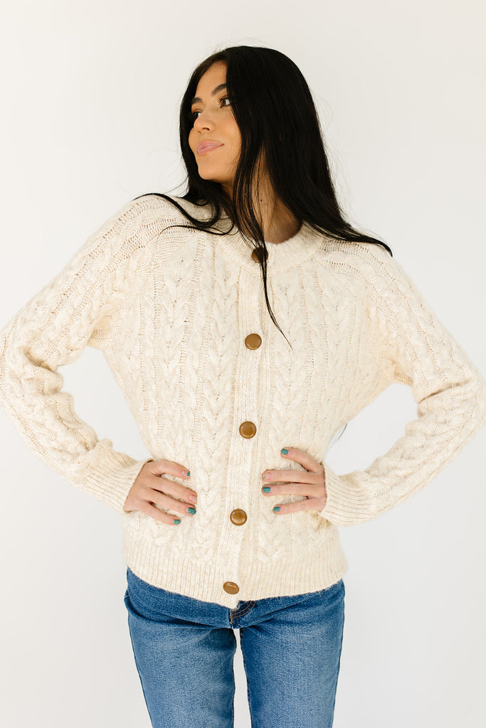 a spring outfit essential, this neutral cable knit cardigan has those trendy “cottage core” vibes. it features chic brown buttons + can be worn open or closed for endless styling possibilities. dress it up with a silk skirt + heels, or down with jeans + sneakers.