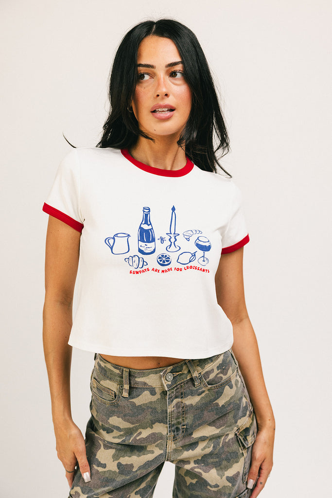a graphic tee, but make it très chic. this cropped baby tee has a comfy, lived-in fit + features red trim + a bright blue french-inspired illustration. the perfect not-so-basic tee to pair with denim, skirts, + shorts all season long.