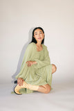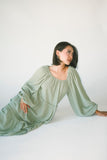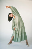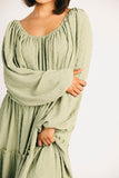 - sage // maxi length, scoop elastic neckline, long puff sleeves, elastic cuffs, pockets, tiered skirt
