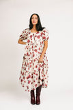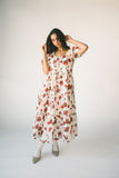 - red floral + off white base // maxi length, lined, puff sleeve, tiered skirt, elastic scoop neckline, pockets