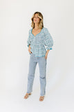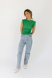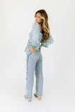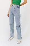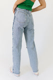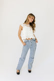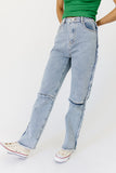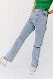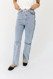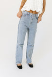 - light wash // straight leg, one button zip fly, pockets, belt loops, frayed seam detailing