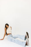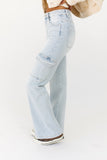 - light wash // wide leg, high waisted, one button zip fly, belt loops, pockets